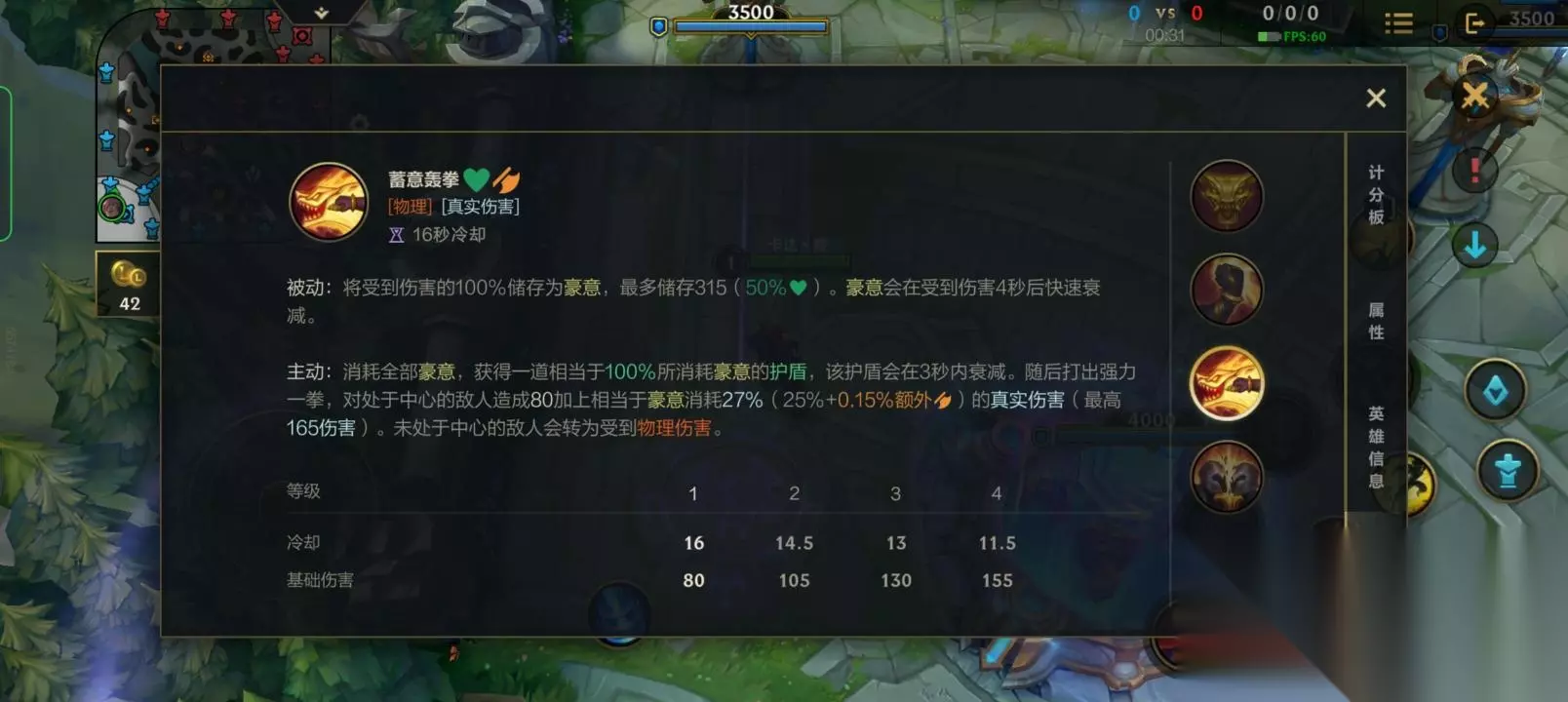 一,腕豪的技能介绍 ①腕豪的被动是沙场豪情:瑟提的普通攻击会交替使用左重拳和右重拳。右重拳稍微强—些,并且攻击速度加快。而且腕豪会基于他的已损失生命值而获得额外的生命回复。