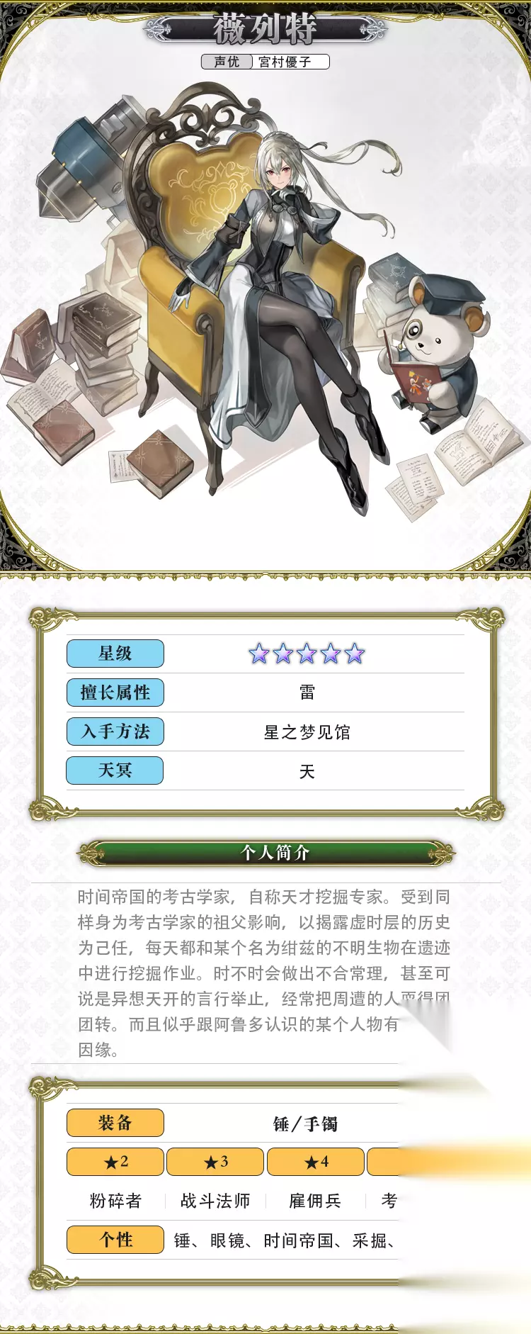 固有能力 【以前卫身份战斗开始时】 以前卫身份结束回合时,自身累积1个「古文献搜罗」+累积1个共鸣〈贯穿〉 【ZONE能力「充电」】 招雷阵/极·招雷阵时:根据战斗中发生的雷属性攻击次数(包括疯狂之力:带电等)积累能量(最多99) 根据累计数值使雷属性攻击造成的伤害UP 每回合结束时累积的能量会减少15 招雷阵觉醒为极·招雷阵时,累积的能量会继承;招雷阵/极·招雷阵被覆盖或破坏时,累积的能量会清空消失 【共鸣〈贯穿〉】最大累积10 根据累积数值暴击率UP+魔法暴击率UP(最多200%) 绝ZONE展开时追加:我方全体附加贯穿障壁 【古文献搜罗】最大累积:5 技能获得强化 【电流脉动】最大累积:99 根据累积数值物理/魔法耐性10%DOWN(最多累积99) 【状态:遗址发掘】 技能威力1.3倍 【连锁能力】 自身以外的我方使用雷属性攻击技能时,自动追加发动连锁专用技能〈天火遗痕〉(每回合最多发动3次) 【天火遗痕】 给予任意一个敌方单位雷属性打攻击3次(特大)+赋予破碎+自身累积1个电流脉动(效果至回合结束时) 根据「古文献搜罗」累积数值增加攻击次数(最大6次) 「电流脉动」累积数值增加(最大6个) 星导能力 ◆前卫拥有个性「雷」的伙伴2人以上时发动: 战斗中自身行动时,累积的天之力增加(小/中) ◆星导爆裂发动时,天之力较多时发动: 我方全体暴击伤害30%UP+魔法暴击伤害30%UP(效果至回合结束时) ◆以前卫身份战斗开始时展开招雷阵/极·招雷阵 固有技能 【愤怒雷击】魔法值:35 给予全体敌人4次雷属性魔法攻击(小)+我方全体暴击率100%UP+魔法暴击率100%UP(3次行动) 威力受自身力量影响 【充电累积50以上时追加】技能威力提升(5倍)+全体敌人雷属性耐性30%DOWN(3回合,最多可累积3次) 【狂怒雷击】魔法值:47 给予全体敌人4次雷属性魔法攻击(中)+我方全体暴击率100%UP+魔法暴击率100%UP(3次行动) 威力受自身力量影响 【充电累积50以上时追加】技能威力提升(10倍)+全体敌人雷属性耐性40%DOWN(3回合,最多可累积3次) 【结构瓦解】 MP:64 先制对全体敌人附加以下效果: 力量35%DOWN+智力35%DOWN+速度35%DOWN+增益效果逆转(3回合) 【追加效果】 共鸣〈贯穿〉累积10时,减益效果量变为100%+自身累积5个「古文献搜罗」 消耗所有共鸣〈贯穿〉 解锁技能 【椎心蚀雷】魔法值:20 给予全体敌人5次先制的雷属性魔法攻击(小)+附加中毒和受伤效果(永远持续,无视对方耐性) 威力受自身力量影响 【雷威】魔法值:40 我方全体力量50%UP+智力50%UP+速度50%UP+雷属性攻击力50%UP+最大MP25%UP(5回合) 【招雷阵展开时追加】增益效果量增加(2倍)+我方全体根据MP最大值魔法伤害UP(3回合) 【雷光冲击】魔法值:32 给予全体敌人5次先制的雷属性魔法攻击(中)+附加昏厥效果 威力受自身力量影响 【战斗开始后3回合以内追加】敌人越多技能威力越大(最多5人/10倍) 【古拙厉雷】魔法值:50 给予全体敌人5次先制的雷属性魔法攻击(大)+展开招雷阵+给予我方全体治愈效果(固定值1500)+MP治愈效果(固定值50)(5次) 威力受自身力量影响 【招雷阵展开时追加】进行ZONE觉醒+回复量增加(2倍) 【构造剖析】 MP:68全体敌人附加以下效果: 全属性耐性100%DOWN(效果至回合结束时) 我方全体附加以下效果: 全属性攻击100%UP(3次行动) 【追加效果】 自身累积「古文献搜罗」时,消耗1个「古文献搜罗」 全体敌人附加弱点识破·雷(效果至回合结束时) 我方全体附加以下效果 攻击弱点时伤害UP(效果至回合结束时) 星导技能 【文明终焉】 MP:112/95 自身附加以下效果 变换为 状态(5回合) 遗址发掘> 给予全体敌人雷属性打攻击(特大) 【星导爆裂时】 根据自身「古文献搜罗」的累积数值技能威力提升(最多75倍)+累积1个「古文献搜罗」 搭档:绀兹 AS星级:★★★★★ 自动技能:【时光修补】 充能+1 我方全体回复HP(大)+回复异常状态+有很小的机率解除减益效果 【招雷阵展开时追加】充能的累积量+1 < > 根据状态提升技能效果> 回复效果量77%UP 充能技能: 【雷能汇聚】充能-5 我方全体附加自由变换(雷)+异界之力数值回复30%(效果至回合结束时) 【薇列特「考古学家」在前卫时追加】薇列特附加连击数UP的效果(3回合) 光环1:发动条件:招雷阵展开时 光环效果:我方全体HP·MP最大值30%UP 光环2:发动条件:「大气」系统的环境效果出现时发动 光环效果:我方全体暴击率·魔法暴击率100%UP 使用注意事项: 1、觉醒提升:很高 2、定位是雷属性攻击辅助,强度很高。 3、保留了绝大部分NS形态的强力的BUFF,单人开场直接开极·招雷阵,直接制造环境;每回合最大10次的强力补刀;几乎无责任的常驻弱点识破;超高降耐。 4、超高的强度可以直接把雷队带到整个游戏现阶段的T0级别。 5、未来的版本会修正转属机制,再次拔高该角色的强度。