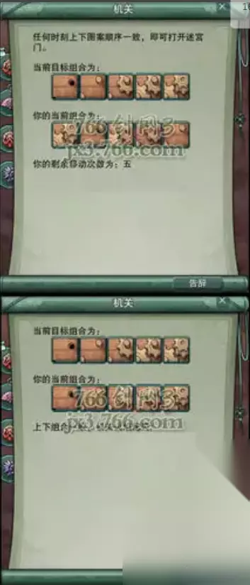3、下面说说【夺回圣火令】任务【开机关】的方法:机关上显示有两行,第一行是目标组合,它的意思就是让我们把第二行的顺序调的跟第一行的目标顺序一样!如图:但是当你移动第二行的时候,第一行就会整体的向左平移一格,一共可以移动五次。所以,移动到5次的时候,回到最初的位置,也就是说第二行在移动五次后还是和第一行原来一样!你只要把第一排的图记住!第二行的以第一行最原来的为目标移,很快你就能打开贤者之门了!