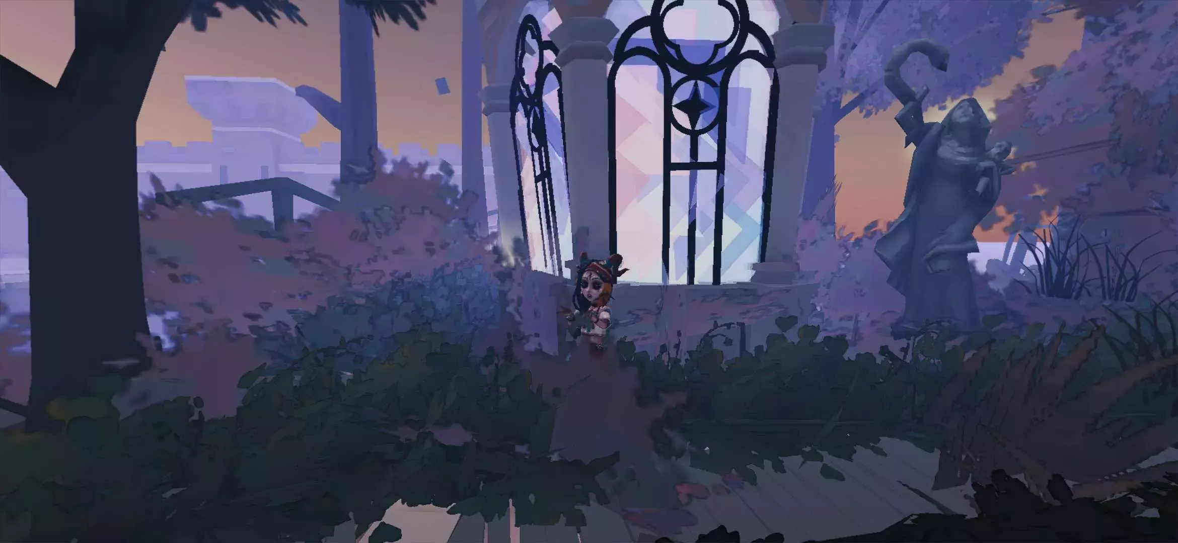 这个图,我们的祭司儿正站在大门前,做着动作,周围的景色是非常美丽,旁边还有一个花园