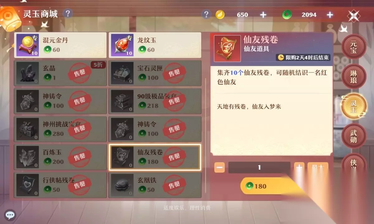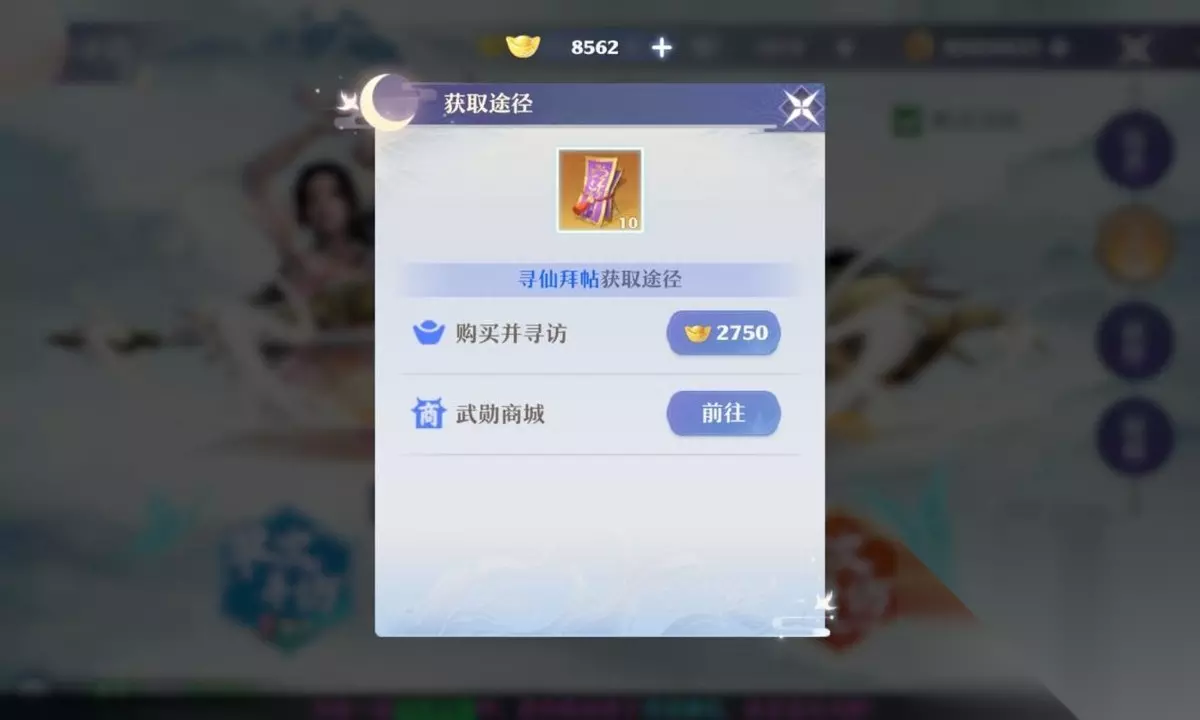 参与世外寻仙时可以直接使用元宝购买寻仙拜帖(拜帖已经无法使用元宝购买),售价275元宝,不限购。 温泉戏水: 参与温泉戏水有概率产出拜帖。 周赏: 每周日常活动完成度达到要求时可以获得拜帖,最多可以产出4张。 战令: 1级精英战令可以获得1张拜帖,购买梦诛战令可以获得10张拜帖。 月卡宝箱: 购买月卡后每天开启月卡宝箱有较小概率获得拜帖。 琳琅阁: 琳琅阁有概率刷出拜帖,需要使用银两购买。 仙友残卷获取途径: 灵玉商城: