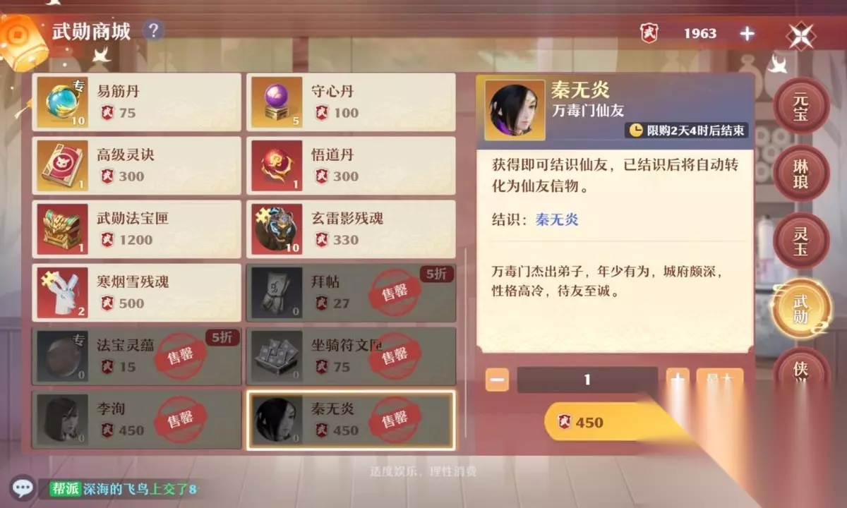 每周可以兑换10个谢红妆信物。 武勋商城: 每周可以兑换10个李洵信物和10个秦无炎信物。 仙友寻访: 四海寻访(每天可以免费参与1次)或者世外寻仙均有概率产出仙友信物,需要消耗拜帖或者寻仙拜帖。 仙缘商城: 每次仙友寻访可以产出一定数量的仙缘,同时仙友满星之后再次获得仙友信物会转化成仙缘。在仙缘商城可以使用仙缘兑换各种品质的仙友,每周刷新上架仙友,购买后也可以花费200元宝重置(不会改变仙友,只会增加1次购买机会)。 仙友闯关: 参与仙友闯关成功通关可以获得阿笙信物*5,金瓶儿信物*5,司生信物*3或者陆雪琪信物*2。 精英据点: 挑战精英据点有概率产出碧瑶信物*1或者天玑信物*1。 仙友残卷: 凑齐10张仙友残卷也可以合成随机红色仙友。 拜帖产出途径: 武勋商城: 在武勋商城可以购买拜帖和寻仙拜帖,拜帖售价55武勋,每周限购20张;寻仙拜帖售价275武勋,每周限购5张。 仙友闯关: 在仙友闯关中成功通关可以获得一定数量的拜帖。 元宝购买: