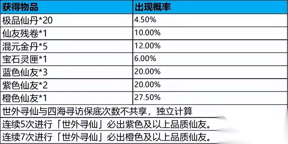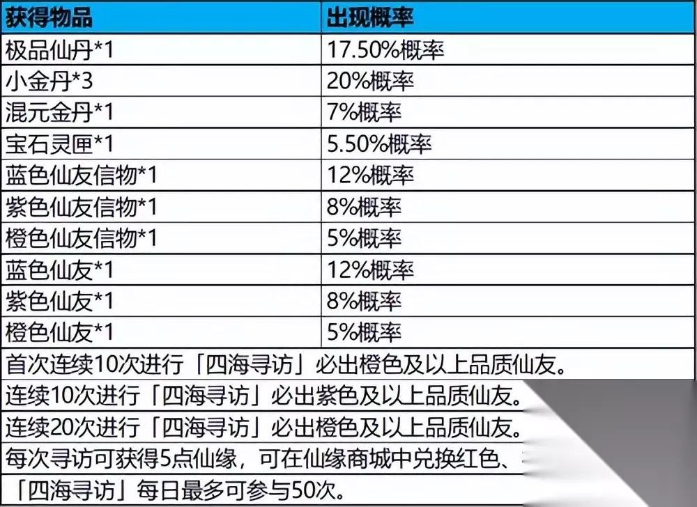 在灵玉商城每周可以使用灵玉兑换2张仙友残卷。 金锭每日礼包: 每周购买5次每日金锭礼包总共可以产出3张仙友残卷。 寻访产出道具概率: 四海寻访: