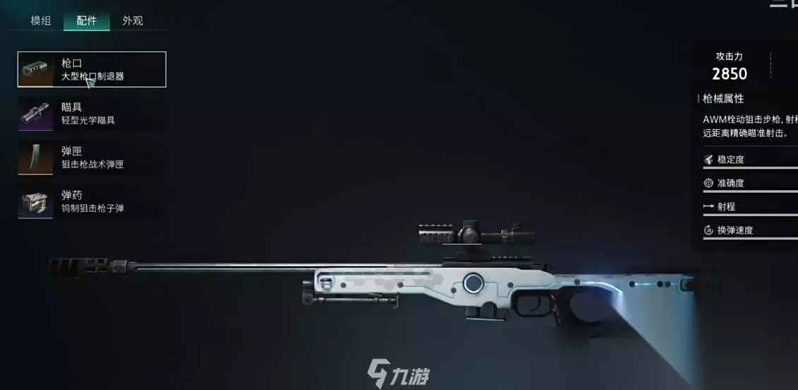 2、配装攻略 武器的配件建议选择制退器、光学瞄具、战术弹匣以及钨制狙击子弹。