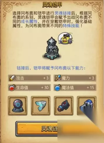 灵魂铠甲拥有两种资源 神性:使铠甲升级,击败小怪和使用部分道具可获得,部分消耗列表见文末附录 魂能:用于穿戴盔甲消耗和施放铠甲技能,下楼和使用部分道具可获得 选择灵魂链接后,你可以穿戴盔甲使盔甲属性和技能生效,穿戴盔甲会每轮消耗3点魂能,魂能不足时自动脱离盔甲注:是否穿戴盔甲不影响灵魂链接效果 灵魂铠甲 链接技能详解 灵魂链接选择不同的系别冈布奥,将获得不同的铠甲属性和技能,战斗系偏向攻击和生命值,魔法系偏向魔力和魔法值,冒险系则均衡成长。 每系都有4个独特技能,包括2个被动和2个主动技能,被动技能只需要穿戴盔甲即可生效,主动技能需要消耗魂能进行施放。 战斗系技能 致残打击(被动):对敌人发起的攻击,造成3倍伤害 血腥曼舞(被动):每击败一名敌人,攻击提升10%,持续本层 战意爆发(30魂能):提升x点攻击,攻击附带20%吸血效果,且攻击时有50%概率造成2倍伤害,持续5轮 收割之刃(50魂能):对敌人造成m点伤害,如果将敌人击败,则恢复n点生命值,并使下一次施放收割之刃造成的伤害提升50% 魔法系技能 魔力爆发(被动):施放魔法时,对所有敌人造成m点伤害,魔法阶位每增加一阶,伤害+n 魔能之刃(被动):攻击敌人时,额外造成m点伤害,效果与冈布奥魔力相关 元素过载(30魂能):提升m点魔力,且施放伤害及恢复类魔法时有60%概率连续施放2次,持续5轮 魔力潮汐(50魂能):令所有敌人陷入魔力潮汐,使其所受伤害增加50%,持续4轮。4轮后,对所有陷入魔力潮汐的敌人造成m点伤害 冒险系技能 全知之眼(被动):场上每存在一名敌人,攻击及魔力提升10% 祝福之体(被动):每轮恢复m点生命值,且免疫所有负面效果 迅捷之风(30魂能):闪避及闪避上限+50%,且闪避成功时,对敌人造成m点伤害,持续8轮 灵魂冲击(50魂能):令所有敌人每轮损失m点生命值,且无法行动,持续4轮 神力刻印使用铠甲进行灵魂链接后可