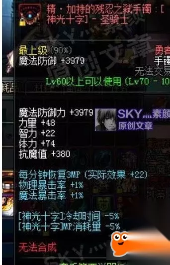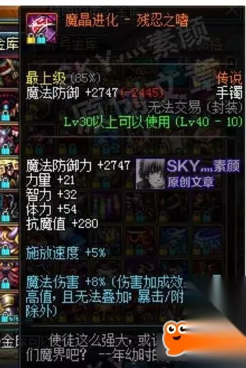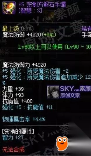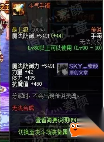 魔晶进化 基础智力+30多,魔法黄字伤害+8%。属性勉强,能作为魔法职业缺少黄字时的过渡装备使用。当然30多的智力虽然不高,但也比没有好,并且由于是传说装备,获取相对来说也比较简单。 [斗气手镯]