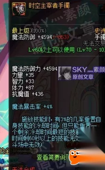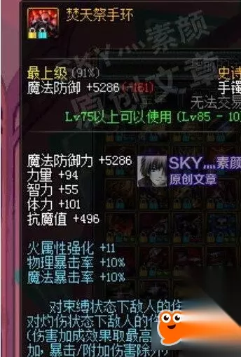 焚天祭手环 基础智力50多点,普通水准。除此之外有火强和暴击率加成,对束缚或灼烧状态下的敌人还有20%的黄字伤害加成。用来堆智力普普通通,用来作为输出散件的话由于异常触发不稳定,效果也比较一般。 [时空主宰者手镯]
