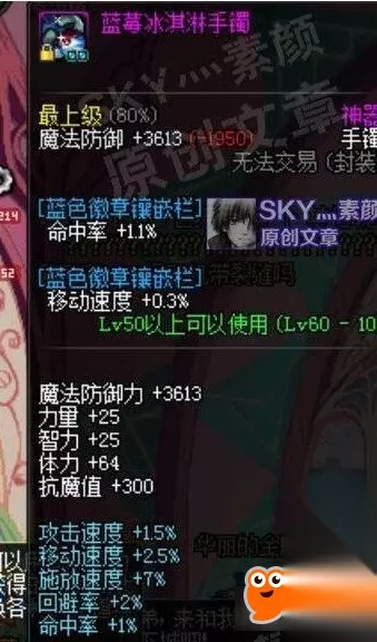 斗气手镯 获得斗气手镯时会随机赋予两条属性,当两条都是四维类的话,就可以调出两条加智力的属性,升到最高级时对智力的加成也是比较不错的。这里斗气装备的属性虽然是蓝字,但确实加的是站街属性,所以对奶妈来讲应该是有效的。 [异界装备]