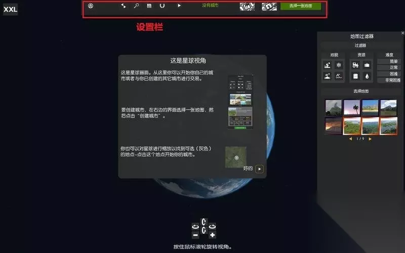 游戏创建菜单顶部设置栏可以选择查看自己正在建造的城市。 同时可以选择载入存档和查看成就奖杯。 右侧则提供建立城市的地点、资源和难度选择。