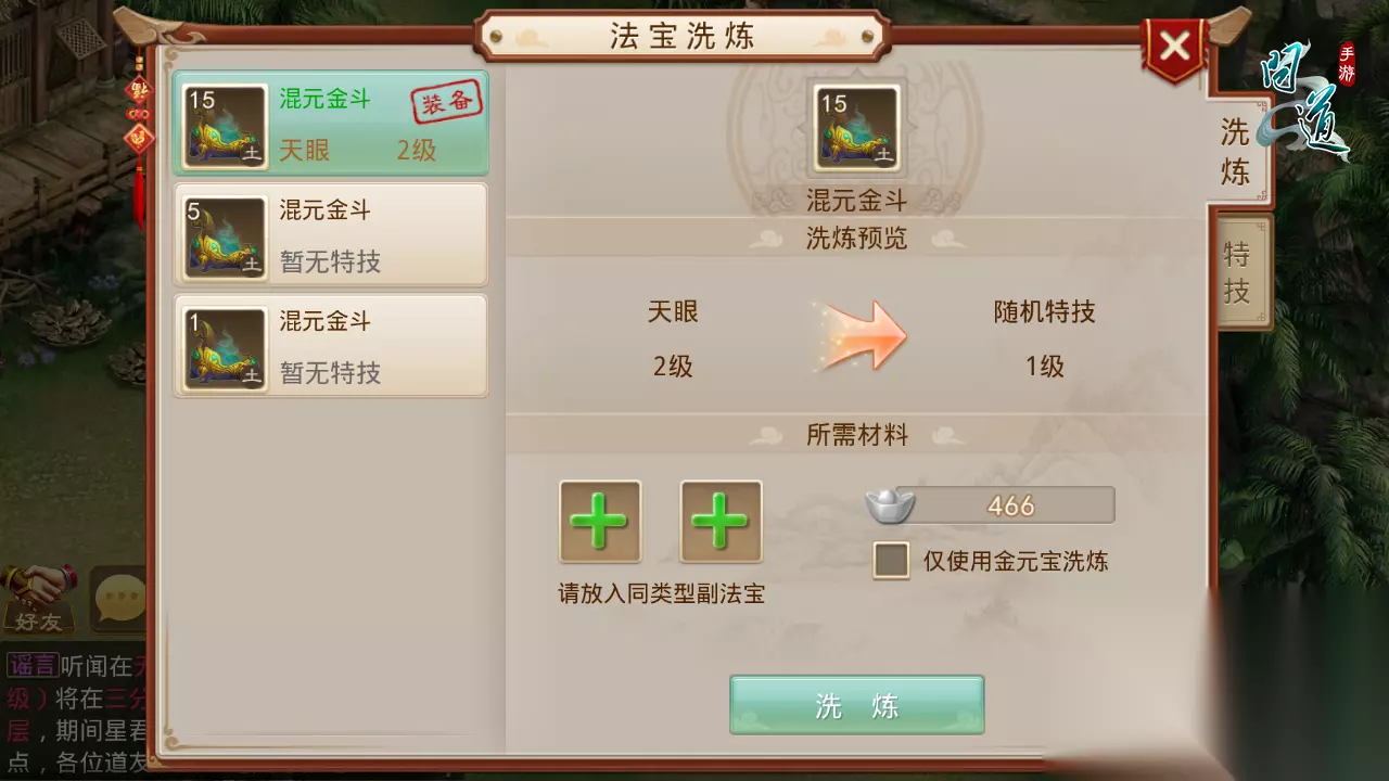 问道法宝特技获得方法 1、洗炼时需选择1个主法宝,消耗2个副法宝、466元宝; 2、主法宝等级在7级以上; 3、副法宝要和主法宝同类型,即名称相同; 4、洗炼必定成功,洗炼后: (1)若主法宝原来没有特殊技能,将随机获得一个1级法宝特殊技能; (2)若主法宝拥有特殊技能,将随机获得一个除原技能之外的1级法宝特殊技能,且原技能消失。