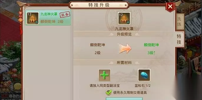 问道法宝特技升级攻略 法宝特技为1-4级时,需要消耗1个副法宝和2个蓝松石;法宝特技为5-9级时,需要消耗1个副法宝和2个芙蓉石;法宝特技为10-14级时,需要消耗2个副法宝和1个红宝石;法宝特技为15级以上时,需要消耗2个副法宝和1个蓝宝石。法宝特技等级不可高于法宝等级。