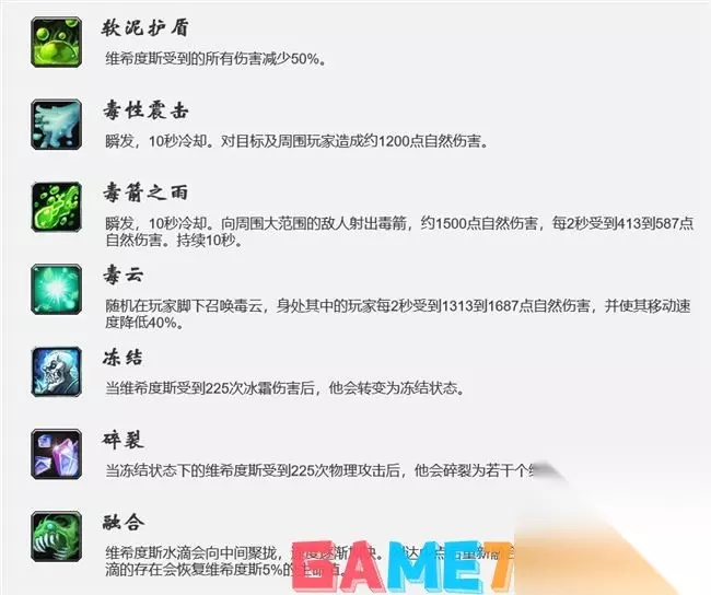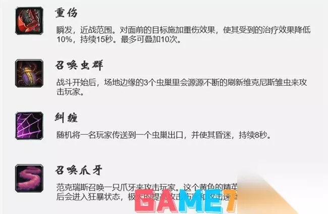 重伤 瞬发,近战范围。对面前的目标施加重伤效果,使其受到的治疗效果降低10%,持续 15 秒。最多可叠加 10 次。 机制处理 两个T一起抢仇恨,副T在主T叠到3- 5 层时嘲讽BOSS。依次循环。 召唤虫群 战斗开始后,场地边缘的 3 个虫巢里会源源不断的刷新维克尼斯雏虫来攻击玩家。 机制处理 所有人集中站BOSS背后,小虫子吃各种减速、定身等控制效果。猎人放冰霜陷阱,人群T拉住小虫子转圈风筝即可。 纠缠 随机将一名玩家传送到个虫巢出口,并使其昏迷,持续 8 秒。 机制处理 治疗给纠缠的玩家随便加点血,吸引到刷新出来虫子的仇恨,使得虫子不会攻击被纠缠的玩家即可。 召唤爪牙 范克瑞斯召唤一只爪牙来攻击玩家。这个黄色的精英虫子在刷新出来的 12 秒后会进入狂暴状态,极大的提高攻击伤害和攻击速度,可以被击晕。 机制处理 旦看到黄色虫子刷新,所有DPS优先集火杀掉它。如果没有及时打死,使用制裁、肾击等手段控制击杀。 5、5号BOSS:维希度斯 ·使用冰霜攻击可以冻结BOSS,冻结后再使用足够次数的物理攻击可以敲碎BOSS。BOSS会分裂成小水滴。 ·每个小水滴代表本地5%的生命值,每消灭一个水滴本体减少5%生命值。 ·如果敲碎时不足5%,BOSS死亡。除此之外无法击杀BOSS。 ·地上的毒云记得走开。 ·巴罗夫管家铃这类能召唤的装备有妙用。