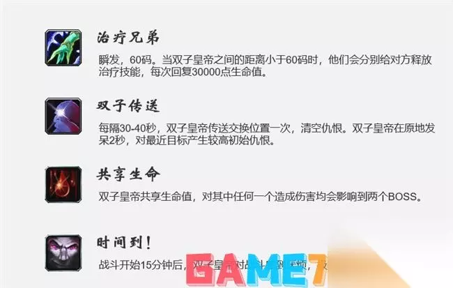 治疗兄弟 瞬发, 60 码。当双子皇帝之间的距离小于 60 码时,他们会分别给对方释放治疗技能,每次回复 30000 点生命值。 机制处理 保持双子皇帝之间距离。 双子传送 每隔 3040 秒,双子皇帝传送交换位置次,清空仇恨。双子皇帝在原地发秒,对最近目标产生较高初始仇恨。 机制处理 两边都安排术土T和战士T,BOSS传送后,战士T抗剑皇,术土T抢魔皇仇恨。 共享生命 双子皇帝共亨生命值,对其中任何一个造成伤害均会影响到两个BOSS。 机制处理 双子皇帝的生命值百分比保持相同,魔皇的生命值比剑皇少。 时间到! 战斗开始 15 分钟后,双子皇帝对战斗感到厌烦,极大的提高伤害值。 机制处理 15 分钟硬狂暴,无解。 维克尼拉斯大帝打法攻略 魔法免疫。