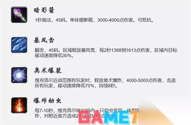 物理免疫。 暗影箭 1 秒施法, 45 码。单体暗影箭,3000- 4000 点伤害。可抵抗。 机制处理 暗抗装术士T拉仇恨,法系可输出魔皇。如战士T抗,法系不可输出。 暴风雪 瞬发, 45 码。区域释放暴风雪,每 2 秒 1388 到 1613 点伤害,区域内目标移动速度降低30%。 机制处理 大概率对治疗放,治疗站位分散。暴风雪来临时,走开。 奥术爆裂 维克洛尔近战范围有玩家时,释放奥术爆炸,4000- 5000 点伤害,击退所有玩家,移动速度降低70%,持续 8 秒。 机制处理 近战远离。如战士T抗。 10 码左右站着吃暗影箭,靠初始传送仇恨来拉怪。 爆炸幼虫 每7- 10 秒,维克洛尔使 30 码内一只幼虫变异,体型增大100%。 3 秒后爆炸,对附近敌方造成 2813 到 3187 点伤害。 机制处理 变大并触角发光的虫子会爆炸,所有人远离。 站位教程: