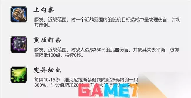 上勾奉 瞬发,近战范围。对个近战范围内的随机目标造成中量物理伤害,并将其击退。 机制处理 治疗注意一下,不会死人。 重压打击 瞬发,近战范围。对敌人造成350%的武器伤害,并使其失去平衡,防御值降低 100 点,持续 6 秒。 机制处理 当前T要堆适当的防装应对。治疗关注好。 变异幼虫 每隔10- 15 秒,维克尼拉斯会促使附近 25 码内的一只幼虫变异。体型增大300%,生命值增加200%,并极大的提高近战物理攻击能力。 机制处理 空闲T和法系DPS联合处理。 维克洛尔大帝打法攻略