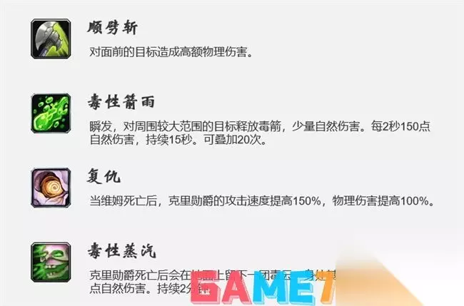 顺劈斩:除了T,不要去boss面前。 毒性箭雨:治疗能解尽量解,为了安全可以吃自然防护药水。 复仇:团队自行选择击杀顺序。 毒性蒸汽:BOSS死亡后赶紧离开,不要去碰绿色毒云。 3、3号BOSS:沙尔图拉 ·BOSS会旋风斩,冷却期间可以被眩晕技能控制。 ·三只小怪也会旋风斩,优先击杀。 ·旋风时躲避,旋风结束后昏迷控制链打输出,如此循环。