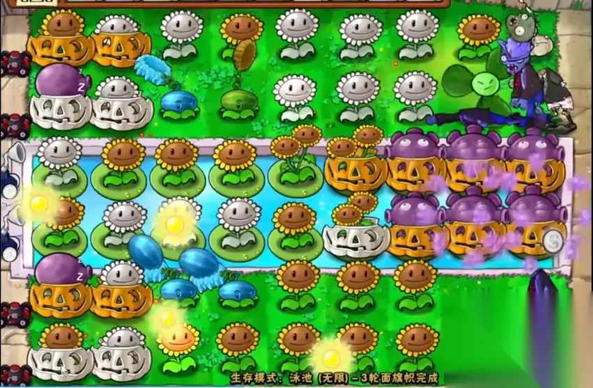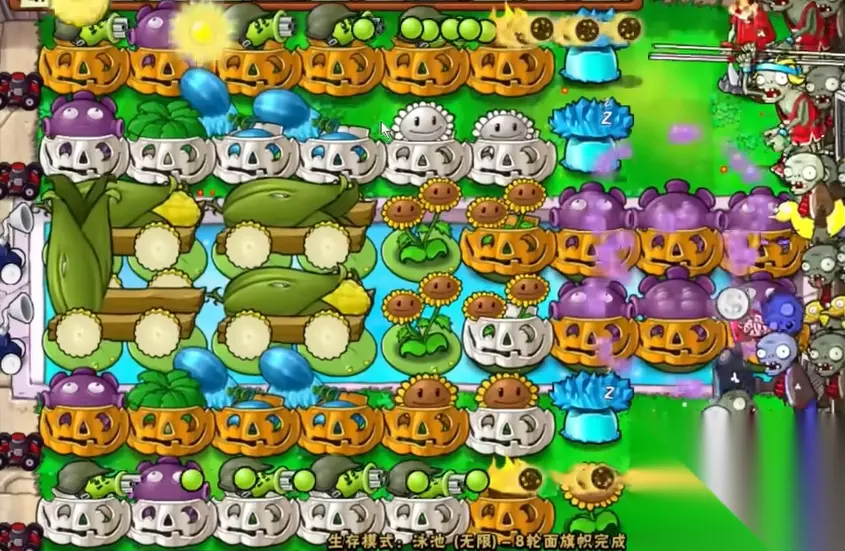 后期重点转向玉米加农炮体系的构建。将泳池前三列植物替换为忧郁蘑菇,陆地逐步替换为玉米投手,最终升级为八门玉米加农炮组成的循环火力网。每轮结束后要及时检查南瓜头护甲的完整性,特别关注2、5路的高坚果防御。针对红眼巨人僵尸,需要两发玉米炮弹集中消灭,因此必须保持至少四门加农炮处于待发状态。