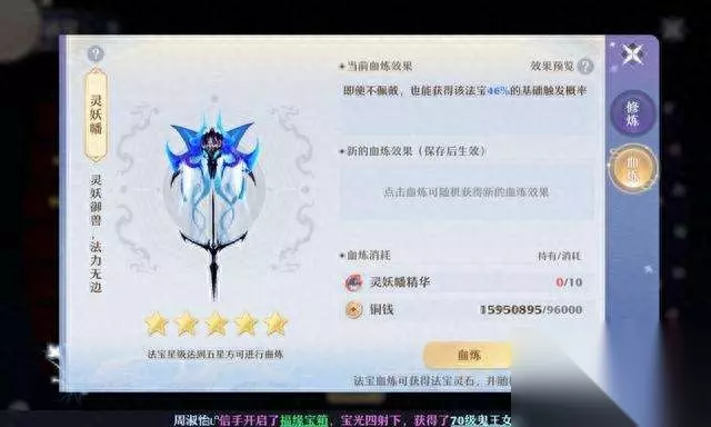 主动法宝: 最多可以同时佩戴4个主动法宝,使用时需要消耗一定的法宝灵能(入场获得3点法宝灵能,之后每回合获得1点法宝灵能,上限是10点)。 主动法宝分为元素,伤害和功能三大类型,元素法宝可以制造对应属性的元素地表,伤害法宝可以直接对目标造成伤害,功能类型法宝各自具备独一无二的功能。 被动法宝: 最多可以同时佩戴4个被动法宝,佩戴之后自动生效。 被动法宝分为御兽,辅助,攻击和防御四大类型,御兽法宝可以增加灵兽的伤害,辅助法宝独一无二的辅助效果,攻击法宝可以增加角色的攻击或者速度,防御法宝可以减少角色受到的伤害,每个类型法宝只能同时佩戴一种。 法宝灵力: 进入战斗需要消耗法宝灵力才能使所佩戴的法宝生效,进入战斗(挑战PVE和PVP)后每个被动法宝消耗2点法宝灵力,每使用一次主动法宝,消耗与使用灵能等额的法宝灵力。 获取途径: 通过日常活动可以获得大量法宝灵力,还可以在武勋商城购买法宝灵石(每个补充20点灵力,售价30武勋,每天限购30个)补充,同时每次法宝血炼也可以产出1个法宝灵石。 法宝修炼: 使用法宝灵蕴和铜钱可以对法宝升星,星级越高法宝的基础属性越高,最高可以升到5星。 法宝血炼: