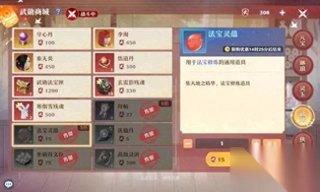 武勋商城每天可以半价购买5个(实际上只需要15武勋,相当于1500银子,只是最高价的3.3折),强烈建议购买。 交易行: 可以直接在交易行购买,初始价格2000银子,最高价格4500银子。 仙师试炼: 每天挑战仙师试炼有概率产出法宝灵蕴。 限时活动: 在限时活动中也有概率产出法宝灵蕴。