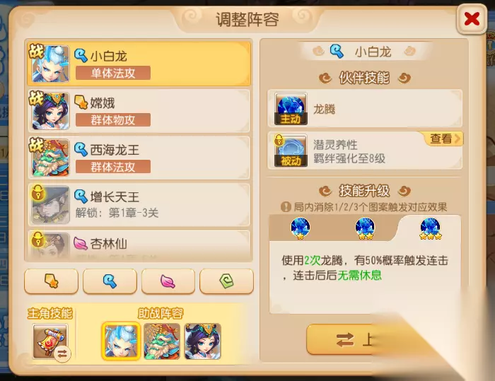 (四)调整阵容 随着关卡的推进,会持续解锁新的强力助战。灵儿推荐使用西海龙王+小白龙+增长天王的组合应对前期关卡;