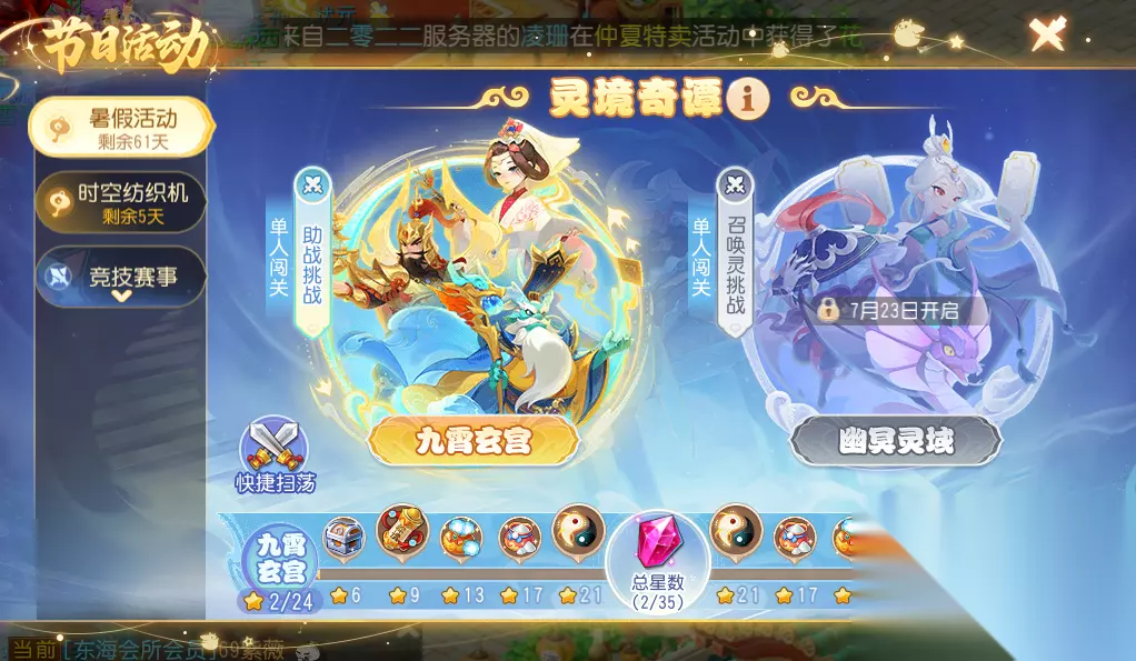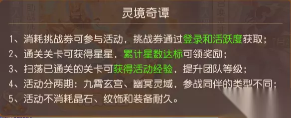 接下来,就由灵儿为大家介绍本次暑假活动的玩法攻略,动动手指便能轻松将奖励收入囊中! 一、活动简介 暑假活动分为九霄玄宫(助战闯关玩法)以及幽冥灵域(召唤灵闯关玩法)。前者于6月26日00:00开启(测试服务器于6月25日10:00开启),后者7月23日才会开放游玩。因此灵儿在这里先讲解九霄玄宫这一活动的玩法技巧。 该活动可概括为:累计活跃度获取挑战券——消耗挑战券推进关卡或是扫荡提升团队等级——积累星星赢取奖励这3个环节。因此不要忘记刷每天的活跃度哦,不然容易缺少挑战券。