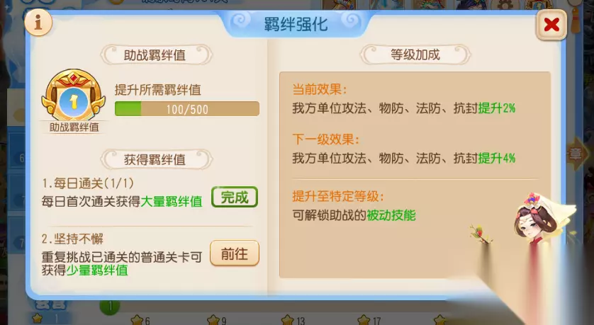 (三)提升团队 各位少侠如果感觉推进新关卡时较为困难,不妨回过头去扫荡已通关的关卡,通过提升助战羁绊值解锁强力被动技能和等级加成,提高助战整体能力、等级加成会提升全队的各项属性。
