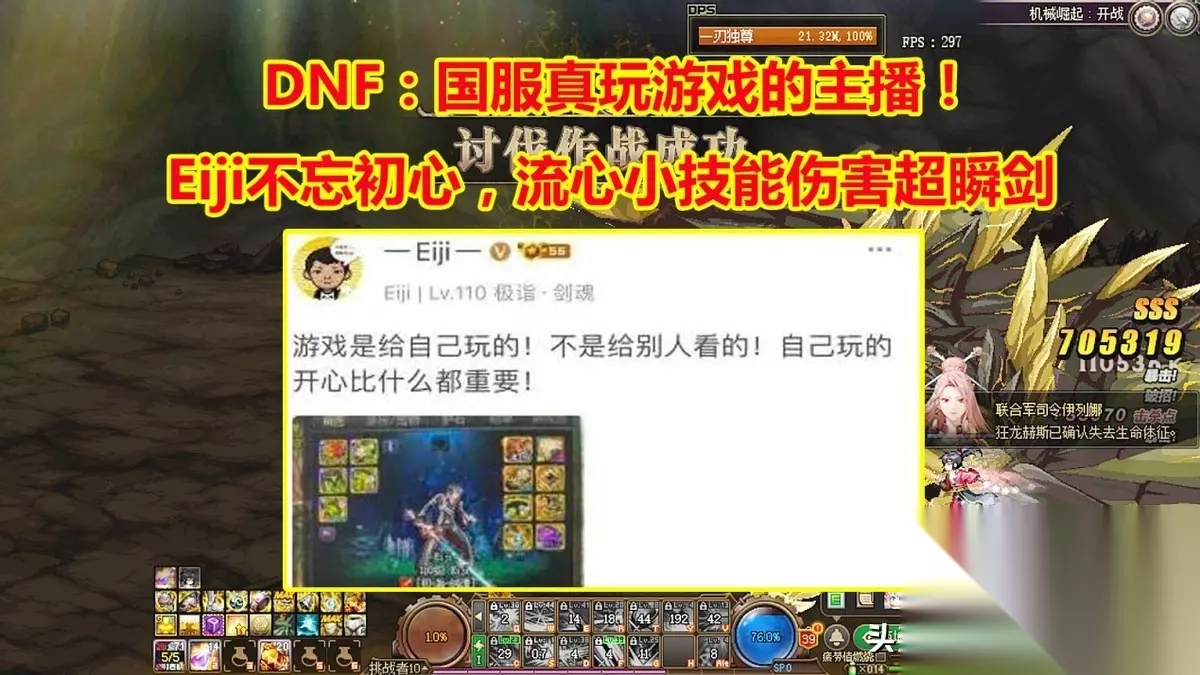 地下城火爆的原因其实有2个,一个是操作,技术流大神是玩家敬仰的对象,一个是免费,在点卡游戏的时代独树一帜。但是策划无脑加强氪金数据,游戏开始转变风格。当初的技术流主播,被氪金主播碾压。不过还是有真正的玩家在坚持,Eiji就是其中一位,这位主播在110版本,也是秉承技术为上。