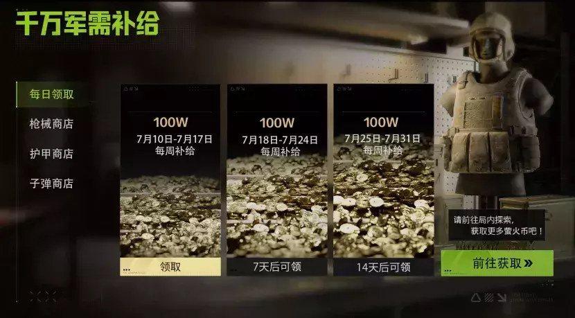 别怕,暑期战备补给——千万军需依旧给大家安排上!7月10日起,暑期再发亿亿亿波每周末轻松领百万军需补给,完成对局任务还能再领百万,再也不怕破产了!普通装备券、高级装备券全方位补足,尽情夺宝,夏日玩尽兴!