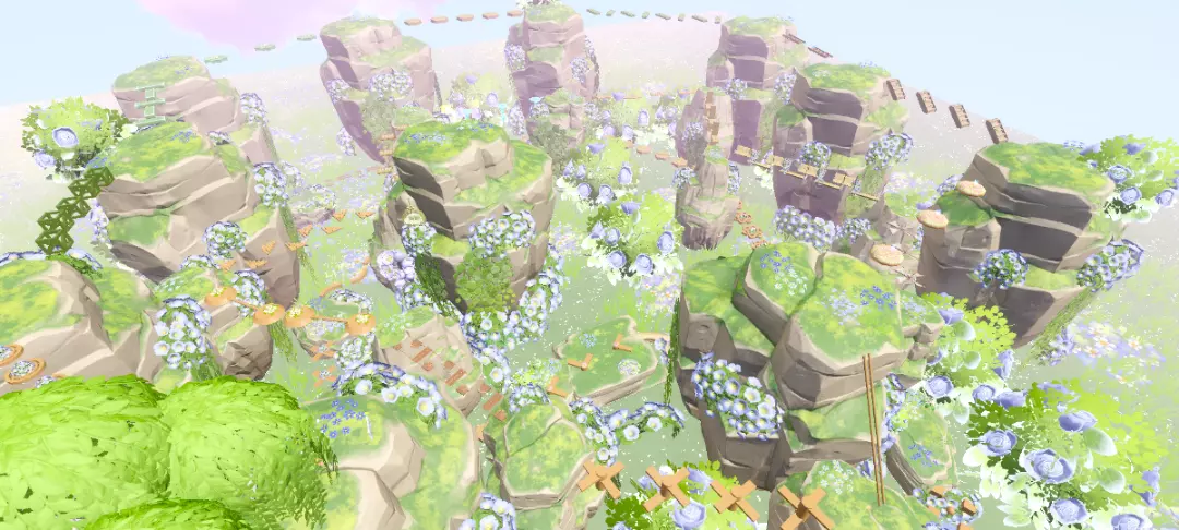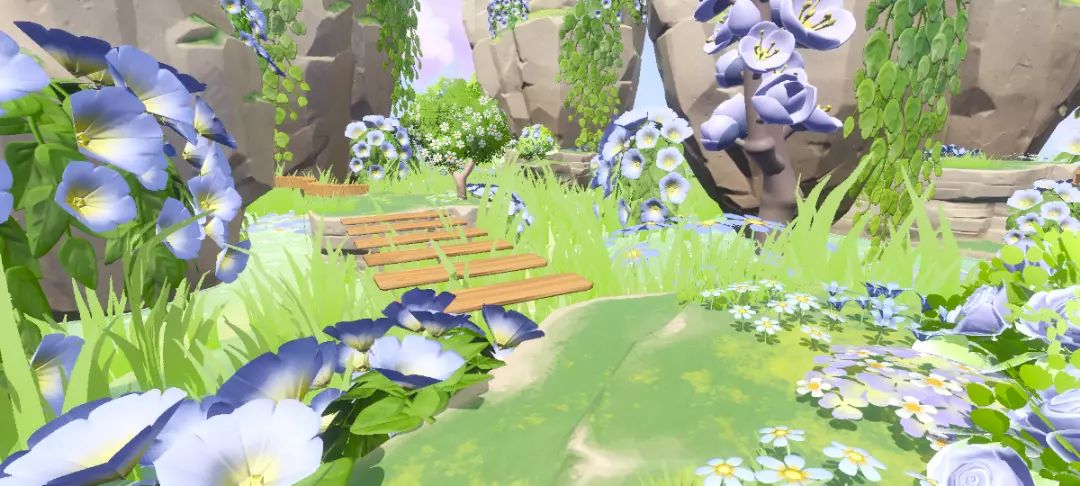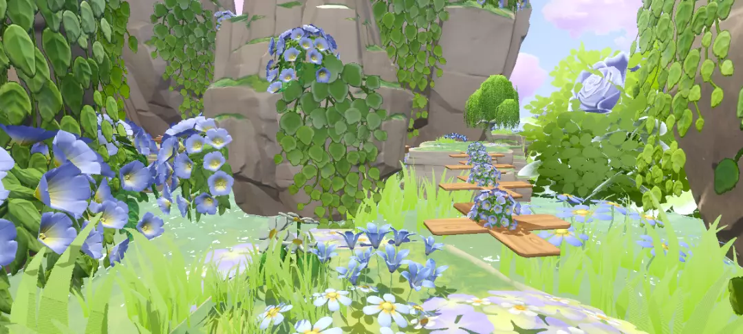 这个山谷之中的跑酷看起来超氛围超自由浪漫,关卡都是超级简单的,周围到处都是可爱的小兰花,蓝绿配色简直不要太养眼~