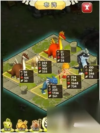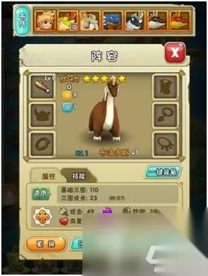2、 阵容系统 进入“主城”中,点击阵容,可看到宠物的装备,能力,资质,缘分和技能 左上角的布阵 更可以根据宠物的级别和战斗力去分配宠物的战斗位置。 在阵容里可以升级强化\进阶\回炉宠物,也可以为宠物进行装备并且对装备进行强化\附魔\宝石镶嵌 在界面上方显示的是上阵宠物的列表.下方为当前宠物的详细信息包络宠物的等级品质宠物名战斗力基础属性技能以及宠物缘分等。