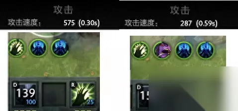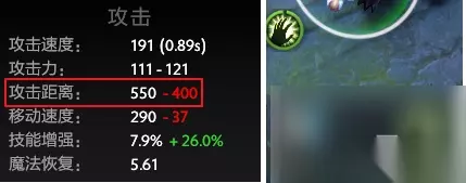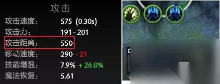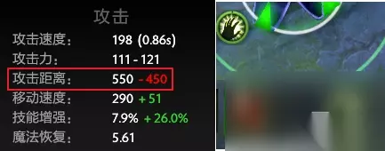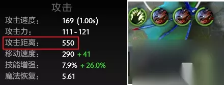 化学狂暴+0.5魔化vs0.5魔化基础攻击间隔 可以看到,基础间隔仍为1,之前的结论完全正确。基础攻击间隔取决于化学狂暴而不是间隔较小值。 近远程(攻击距离) 部分变身技能还可以切换英雄的近远程模式。那么拉比克究竟会发生怎样的变化呢? 切换近远程的技能一共有四个,两个近战转远程——魔化、古龙形态;两个远程转近战——真熊形态、狂战士之怒。 拉比克自己是远程英雄,所以如果单独获得魔化或古龙形态,拉比克的攻击方式都不会发生变化。 而有趣的是,古龙形态虽然描述为增加350攻击距离,而龙骑士的古龙也只有500攻击距离,但是拉比克在释放古龙形态后,攻击距离并不会增加或减少,仍旧保持550码不变。