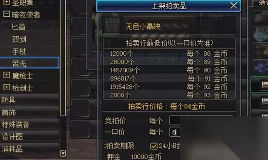 然后可以先直接买最便宜的那一件装备,直接分解,然后看能得到多少的无色和有色晶体,然后把这些晶体的价格算一下,一般来说的话,像以小编自己的经验来说,90级的武器,在1万3以下的价格,你买来分解是绝对不会亏钱的! 大家也可以自己根据自己大区的一个情况来选择,不管是武器,还是防具,选冷门的也是最便宜的!