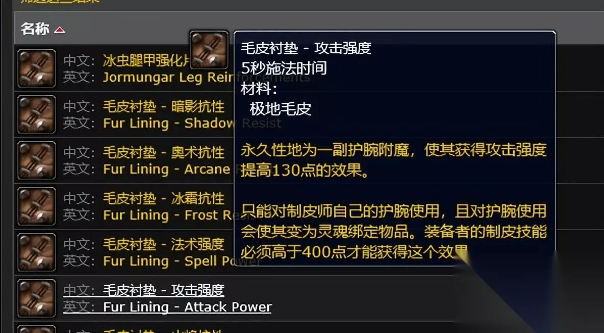 第六皮制品,皮制品可以给自己的手腕赋予专属附魔,但是和主人手腕的附魔冲突,扣除附魔师的属性,可以增加62点耐力,46点法术伤害和80点攻击力量,从属性上来说,和附魔的提升大致相同,除了耐力,多了2点,所以坦克职业制皮的收入会比附魔的收入高2点,所以又一个优势皮制腕带的最大特点是可以附魔各种抗性70点。这是结界大师所没有的。