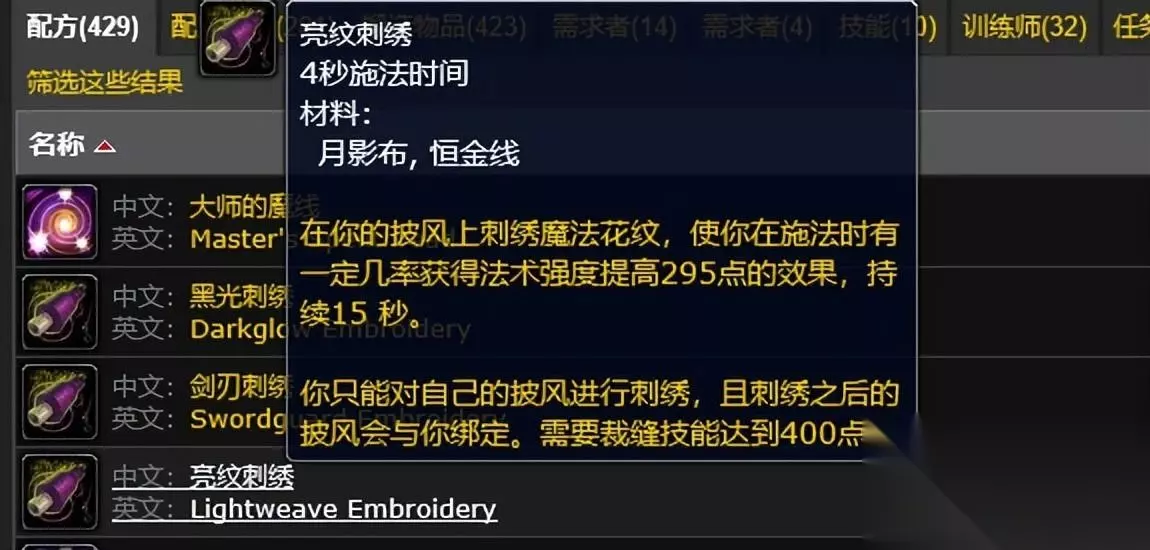 第三位裁缝,除了拥有自己的飞毯外,裁缝还可以给斗篷附魔。比如有一定几率增加魔力295点,持续15秒,或者增加攻击力400点,持续15秒。有机会恢复400 点法力。从裁缝的提升来看,法系输出和治疗职业可能更喜欢裁缝。