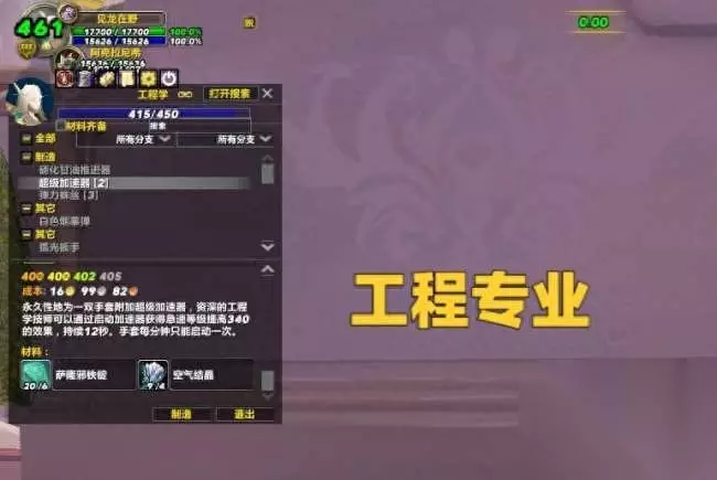 术士作为一个短腿职业,最强的专业自然是工程学,并且工程学不仅有火箭靴,还有手套急速BUFF,仅仅这两个优势就足够了。 除了工程学之外,其他专业的收益其实是差不多的,不过术士作为布甲,最好还是选择裁缝,不仅有披风附魔,还可以在后续版本做一些属性不俗的散件。 胖哥的术士号冲工程专业,1-415大概花费了2500金币。裁缝专业基本没花费金币,毕竟目前布料还是比较便宜的,如果服务器部分低级布料价格较高,也可以自己去刷。 输出手法