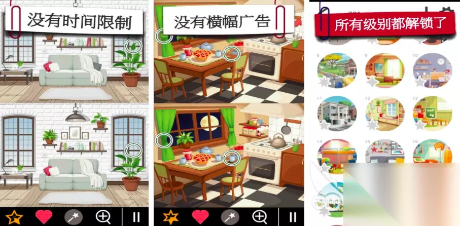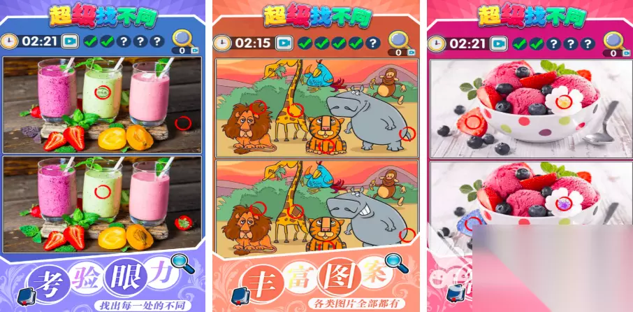 在这款找不同关卡当中,700多个精致关卡内容可供玩家挑战,从手绘画风,到写实风应有尽有,玩家可通过解锁图片,拥有自己的专属照片集,对于集邮爱好者来说,是必备游戏作品,没有时间限制,更加轻松娱乐,无限放大模式,可以让玩家快速锁定不同,在提示上更是没有次数限制,主打轻松娱乐向。 高速下载 普通下载 10、《快乐找不同》