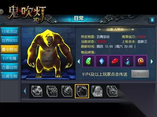 【秘宝成山 凶险惊悚度全开】 摸金、搬山、卸岭三大流派当中,谁能在这凶险无比的倒斗中化险为夷?除了巧妙运用技巧之外,还得有惊人的胆量,古墓凶地,四门皆无生,可由相知,得多可怕多惊险。在《鬼吹灯3D》十王墓穴中,击杀场景内的古代干尸,会获得非常丰厚的经验奖励,以及人熊、冰川冻尸、玉兽等,各大BOSS也将会登场,珍奇宝藏等你来拿,充满挑战的副本玩法等你来体验。