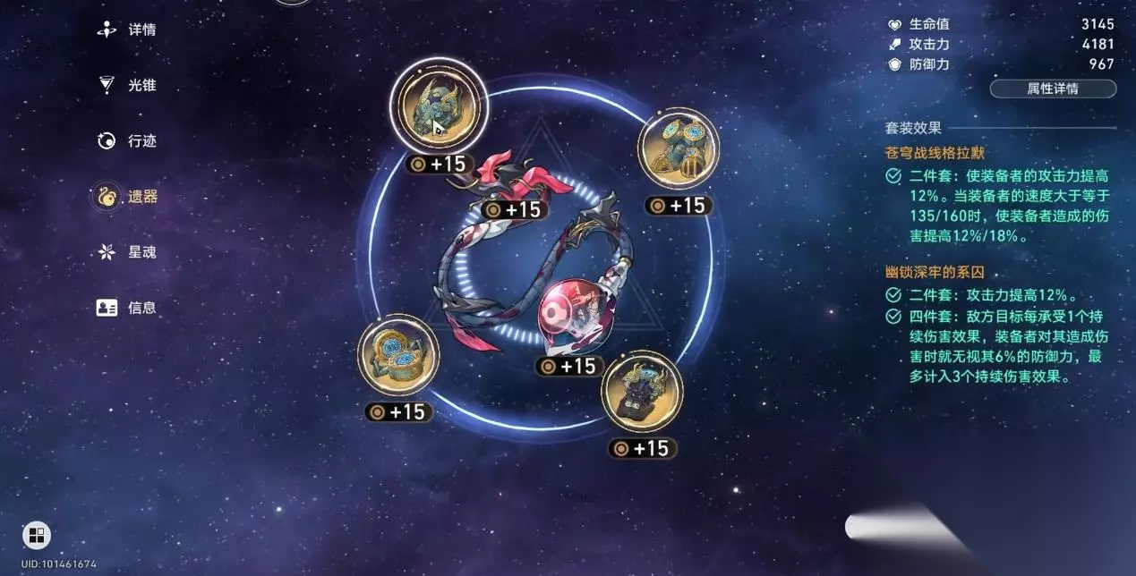 深渊是检验面板的核心场景,尤其是面对混沌回忆 10-12 层的高血量怪物,需保证每发战技都能暴击、伤害足够秒杀小怪 / 压低 BOSS 血线,面板建议如下: 属性 五星光锥(如 “记一位星神的陨落”) 四星光锥(如 “无处可逃”“致胜的瞬间”) 攻击力 2100~2300(含光锥 / 遗器) 2200~2400(四星光锥基础攻击低,需补) 暴击率 75%~85%(无暴击拐必达 75%) 80%~90%(四星光锥无暴击加成,需更高) 暴击伤害 200%~230%(与暴击率平衡) 190%~220%(优先保证暴击率,再堆爆伤) 量子伤害加成 30%~40%(含遗器 2 件套 + 光锥) 28%~38%(同理,靠遗器补) 速度 115~125(配停云 / 驭空,需卡速循环) 120~130(无拉条拐时,需更快出手拿战技点) 关键说明: