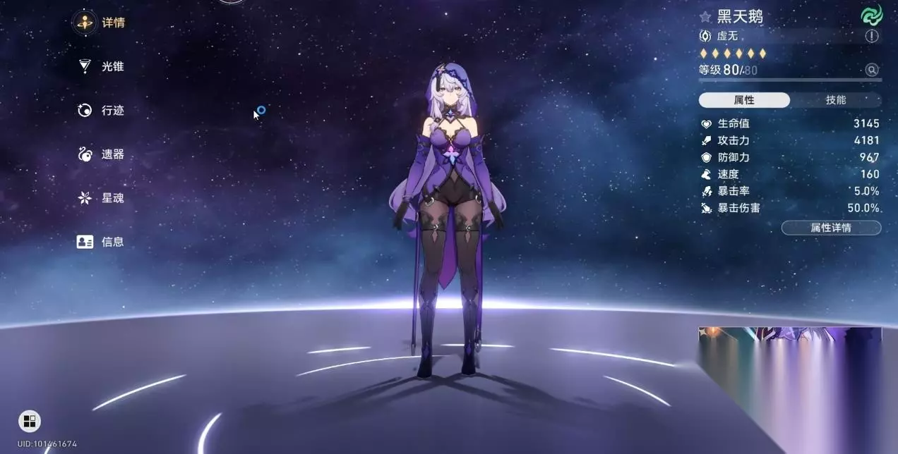 要堆对面板,先搞懂哪些属性对她影响最大。黑天鹅的伤害来源主要是战技(核心输出)、终结技(挂 debuff + 补伤)、普攻(仅过渡) ,且自身无任何 “暴击率 / 暴击伤害” 天赋加成,因此属性优先级排序为:暴击率 > 攻击力百分比 > 暴击伤害 > 量子属性伤害加成 > 速度(注:速度需满足配队循环,并非越低越好,后面单独说) 不同场景的毕业面板标准 黑天鹅的面板需求分 “日常刷本” 和 “深渊高难” 两类,日常要求宽松,深渊需更精准,同时还要看光锥品质(五星 / 四星)调整。 1. 深渊毕业:追求稳定爆发,容错率拉满