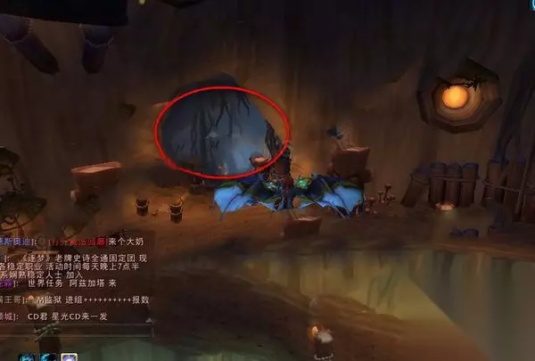如上图所示当我们接到任务来到灰熊丘陵找到任务提示地点发现没有任何npc 2、这时我们可以找到旁边的一个很大的树洞如上图所示,飞到里面去