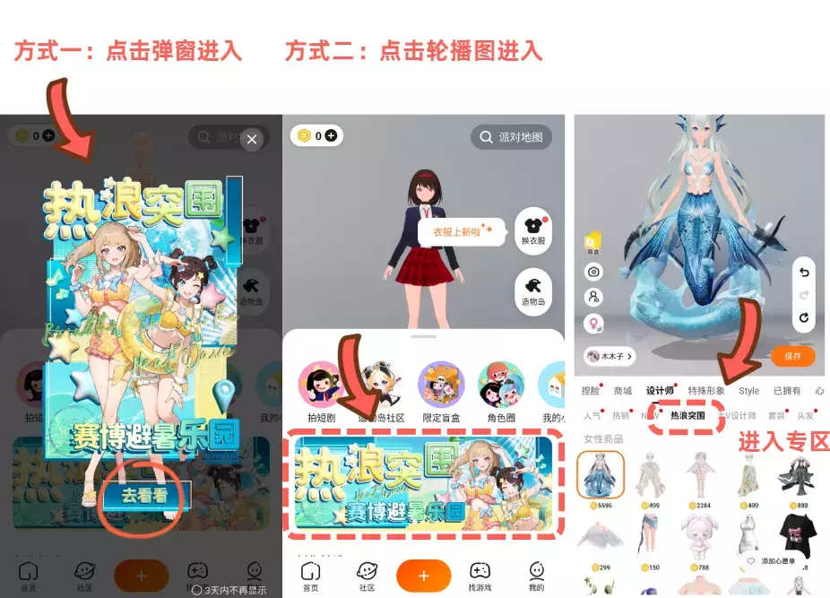 1.进入“热浪突围”专区,选择你心中的降温神器并搭配进你的穿搭中(必须选择至少一件本专区的商品)