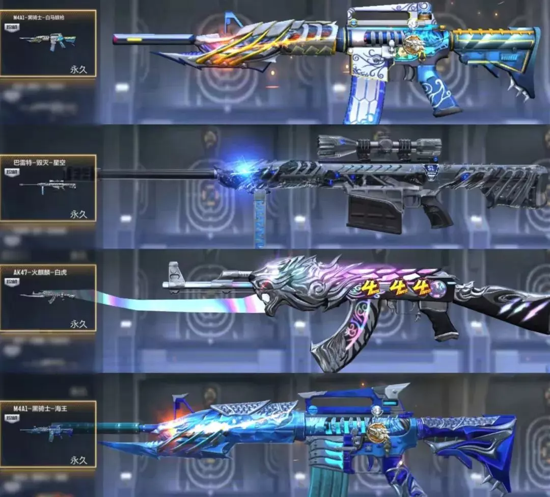 M4A1-黑骑士-白马银枪、巴雷特-毁灭-星空、AK47-火麒麟-白虎、M4A1-黑骑士-海王等四款往期活动皮肤返场,各位CFer可根据实际情况查漏补缺~