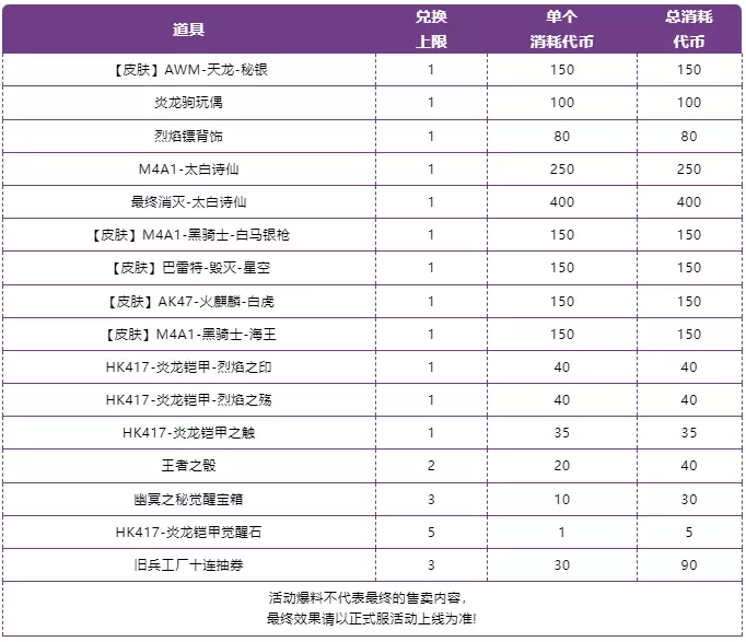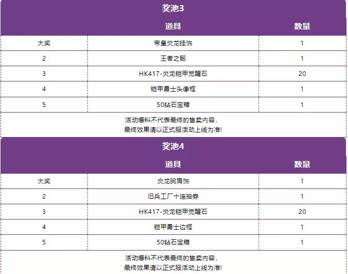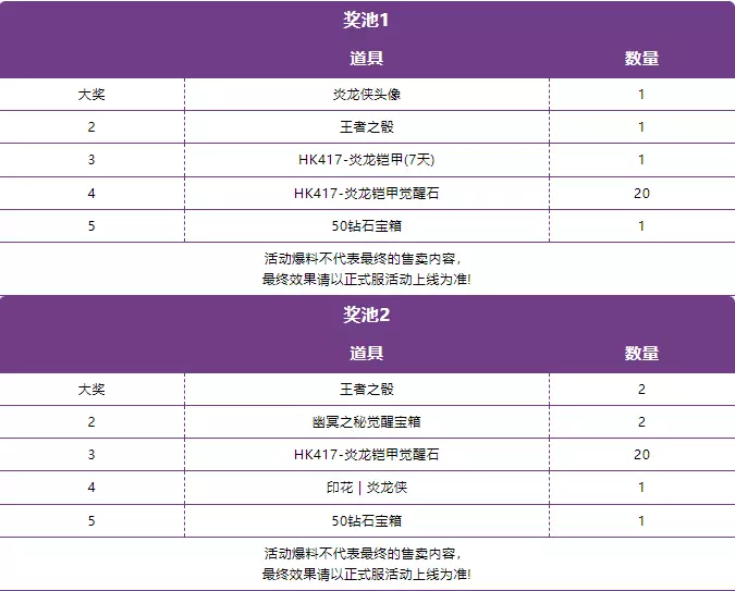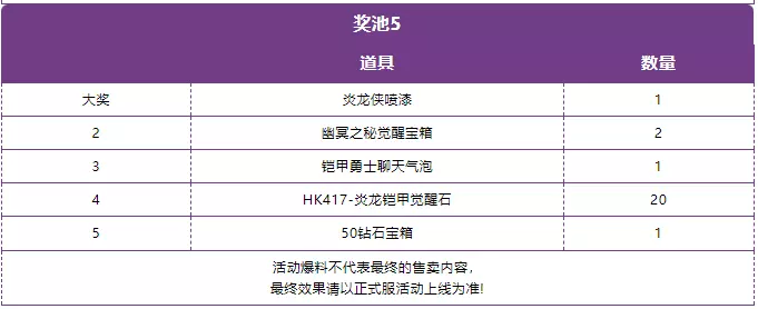 “烈焰封魔”主题活动设置了五轮抽奖,每轮抽奖分为五个奖励,每次抽奖需消耗炎龙币x10,全部完成即可获得HK417-炎龙铠甲觉醒石x100,从而觉醒源 · HK417-炎龙铠甲。奖池道具汇总在下图了,需要的CFer可以自行查看: