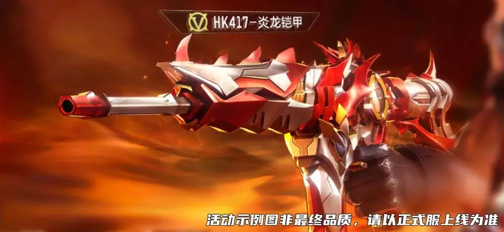 使用火晶石之光能量制造的HK417-炎龙铠甲,蕴含着无限焰火的力量。枪械辨识度极高,多处细节都能一眼看出炎龙铠甲元素,枪械侧面的炎龙铠甲胸前标志更是点睛之笔,很多特效也会通过这里展现~