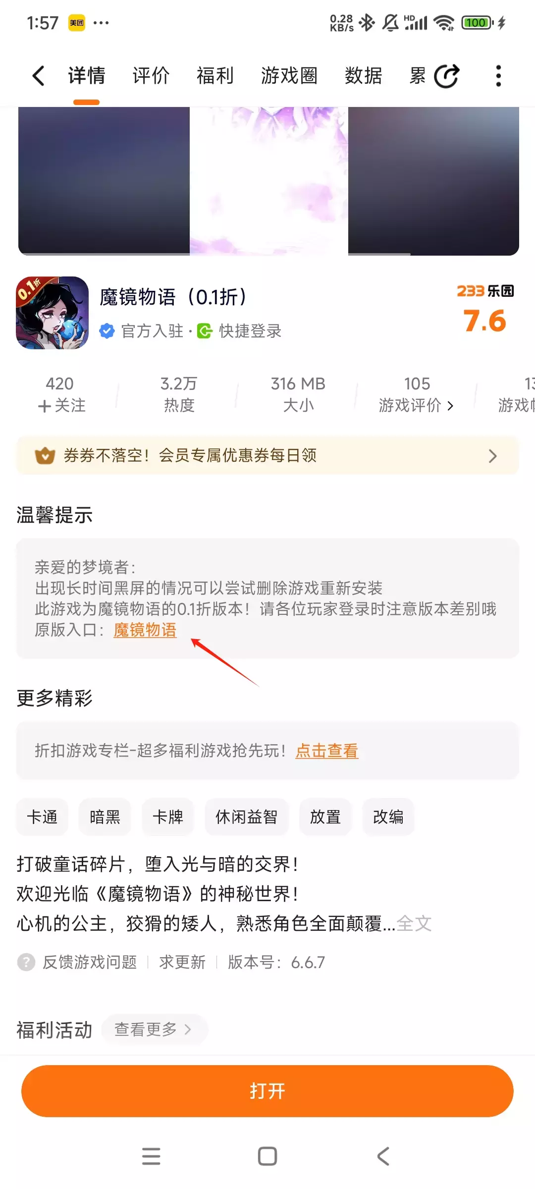现在这个版本是魔镜物语的0.1折版本,大家注意下是否之前游玩的是非0.1折,如果要回到非0.1折版本可以从这里进入哦。