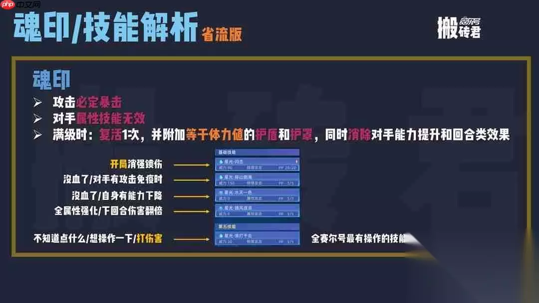 技能解析简要版 鲁斯王攻击必定暴击,并封印对手属性技能;满级时拥有一次复活机会,同时附带大量护盾和护罩,还能清除对方的能力提升及回合类效果。 开局建议使用星光·闪击清除强化并获得锁伤效果,之后持续使用第五技能星光·浪打千击即可。 其余三个技能较少使用:星光·排山倒海可将部分伤害转化为自身体力,并无视对方的伤害限制;星光·水天一色具备免疫异常状态和回血功能;星光·随风逐浪用于增强自身并提高输出。