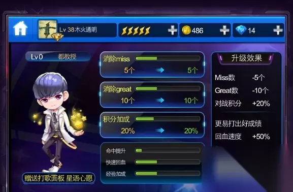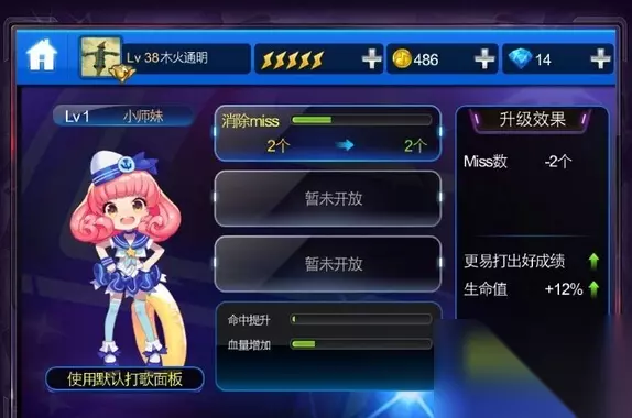 节奏大师小师妹 满级属性 miss数-7个 获得方式:系统赠送生命值+60%