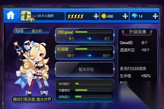 节奏大师魔乐师 满级属性 great数-15个 漏键判定-30个 生命值+150% 防御+60%