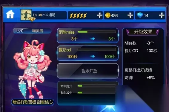 节奏大师喵美眉 满级属性 复活CD 60秒 miss数 -12个 获得方式:金币2888防御 +45%