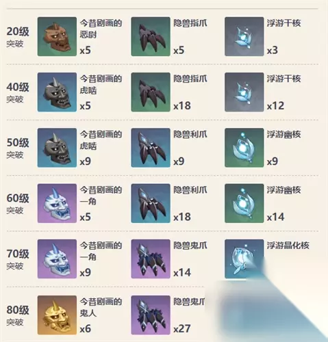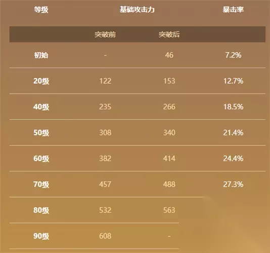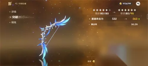 满级攻击力:608 满级暴击率加成:33.1% 武器技能:元素战技和元素爆发造成的伤害提高12%/15%/18%/21%/24%,普通攻击、重击、元素战技或元素爆发命中敌人后,将产生1层持续12秒的【白夜极星】效果。处于1/2/3/4层【白夜极星】效果下时,攻击力将提高(10/20/30/48%)/(12.5/25/37.5/60%)/(15/30/45/72%)/(17.5/35/52.5/84%)/(20/40/60/96%)。由普通攻击、重击、元素战技或元素爆发产生的【白夜极星】将分别独立存在。 武器突破材料汇总: